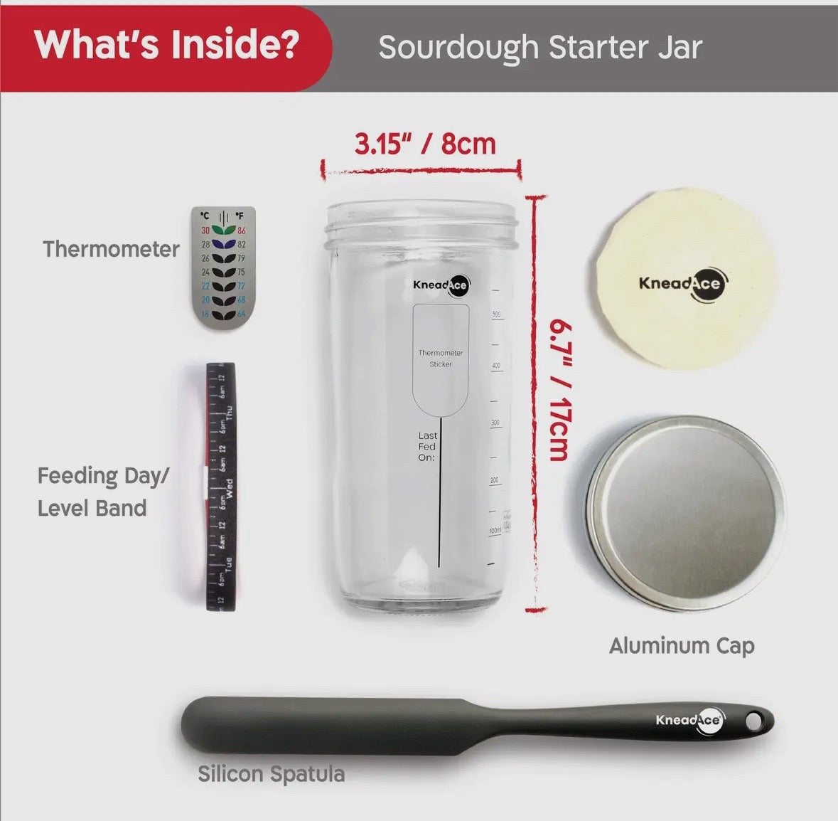 Simplify your sourdough routine with the KneadAce® Starter Jar — designed for easy feeding, tracking, and cleaning. The wide-mouth glass jar features clear measurement markings, a thermometer sticker for temperature accuracy, and an adjustable feeding-day tracker band so you’ll always know when your starter was last refreshed.